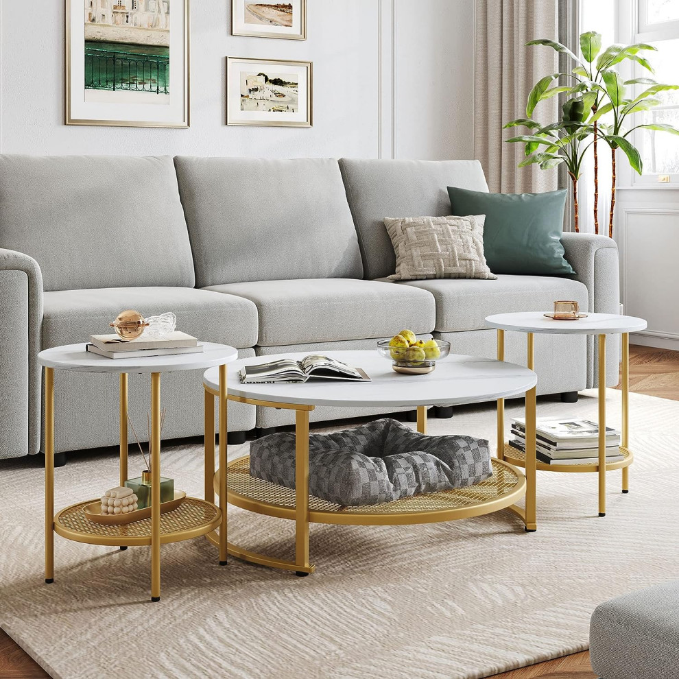 - 2-Tier Coffee table with Storage - The clean-lined top and lower shelf is great for displaying lamps, books, magazines, baskets, and other home décor items. The size of round coffee table is 33.9" X 33.9" X 15.9" while the round end table is 17.7" X 17.7" X 20.1".