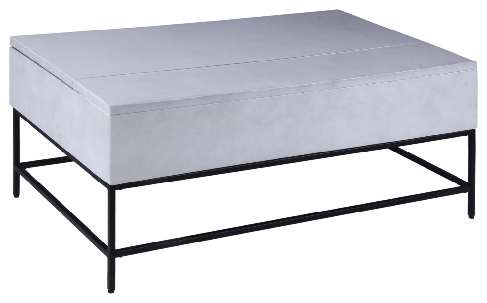 46 Inch Lift Top Storage Mango Wood Coffee Table with Tubular Metal Base,Gray and BlackQuality craftsmanship meets industrial style with this Coffee Table, which is sure to accentuate the aesthetics of your modern interior. Incorporated with a lift top opening mechanism, which opens to reveal a spacious storage compartment, the wide and rectangular top allows you to serve snacks and drinks conveniently. Constructed sturdily from the solid wood and metal frame for lasting durability, the metal hinges facilitate easy accessibility to the storage space. The dual tone finish in the hues of white and striking black finish complements the natural brown interior. A perfect center table for any kind of interior, the spacious storage option will help you keep your interior clutter free. Even though it is inspired by transitional style, this Coffee Table is sure to blend with a variety of decor settings without compromising the integrity of interior.
