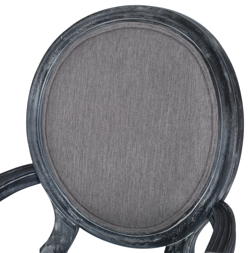 Bask in vintage opulence with seating that will turn your dining room into one of graceful appeal. Drawing from French country inspiration and Queen Anne styling, our set of upholstered dining chairs feature an iconic round backrest, fluted legs, and exquisite armrests to offer your home something a little out of the ordinary while also remaining true to their elegant, old-fashioned roots. Their weathered frames showcase wonderfully contrasting lines and curves that encourage both casual meals with your family or extravagant dinner parties with your guests.