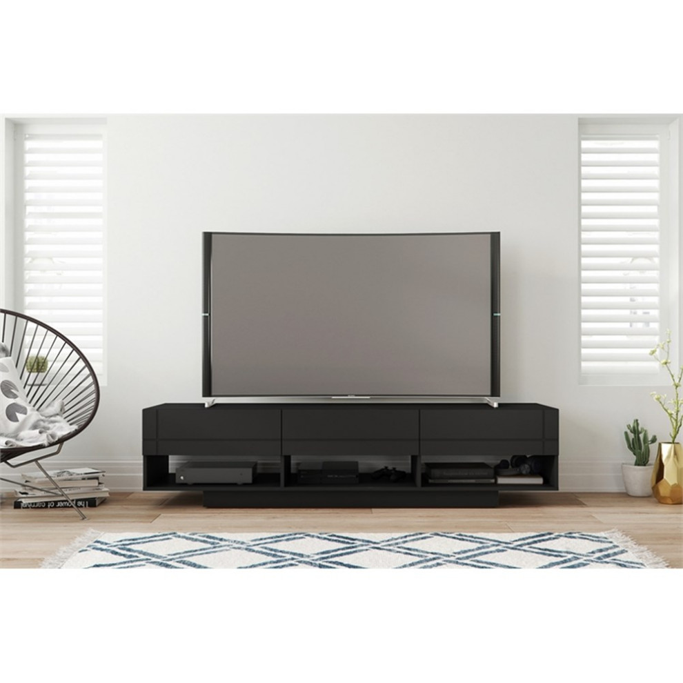 Collection from Atlin Designs is a trendy and easy to live entertainment collection offered in a black melamine and matte lacquer finish. 72-inch TV stand features 3 storage drawers and 3 open spaces for your electronic components; these 3 bottom cubbies are also opened at the back to facilitate wire access and optimize air flow.