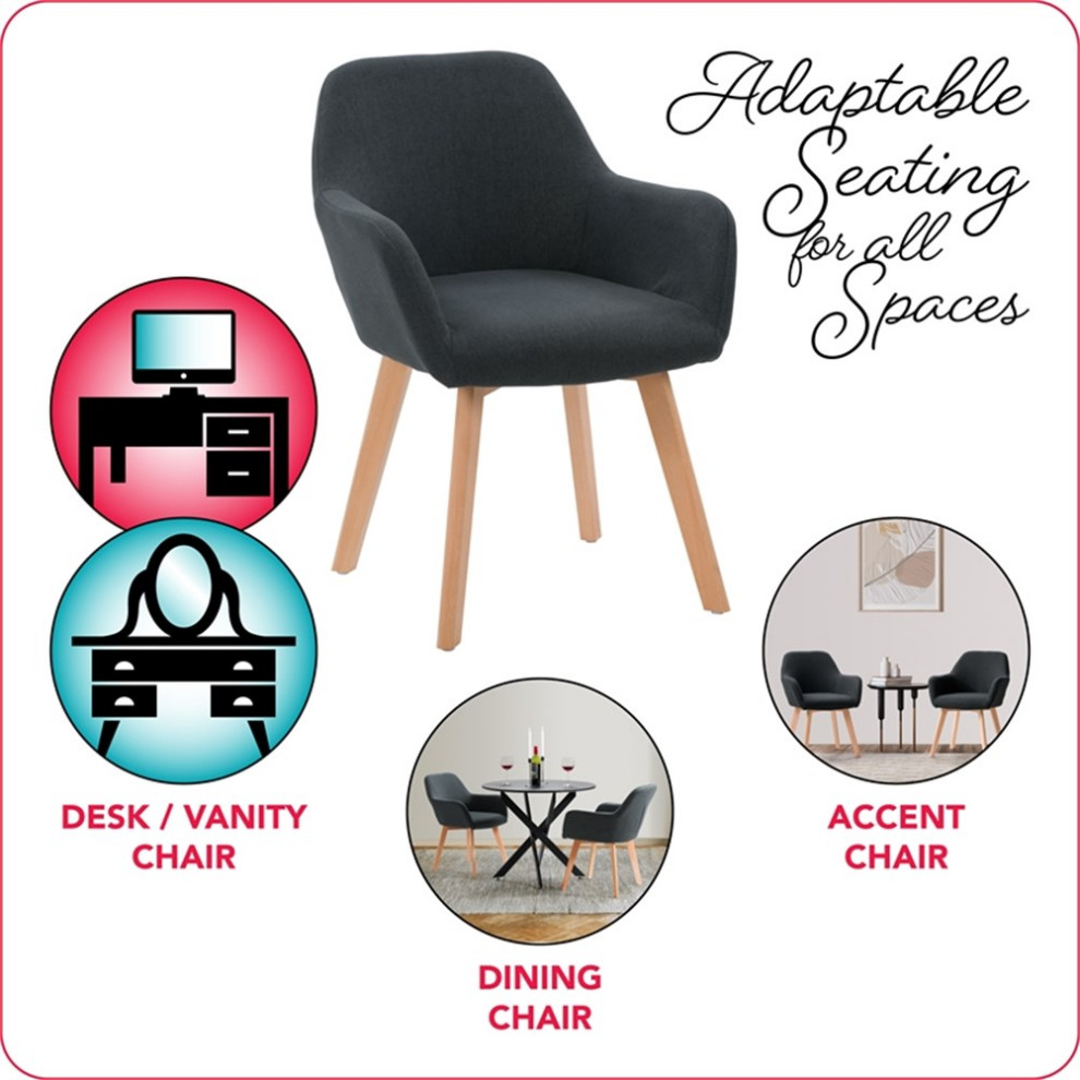 This side dining chair features a slightly curved silhouette and light wood legs for a mix of mid-century with a contemporary Scandinavian touch to your dining space. The sturdy light wood legs support a soft yet durable twill style textured fabric. This chair is a multi-purposeful piece and can be used as a dining chair, accent chair, vanity chair, and more. The padding on the back and seat will have you seated in comfort. Simply attach the legs and take your seat!