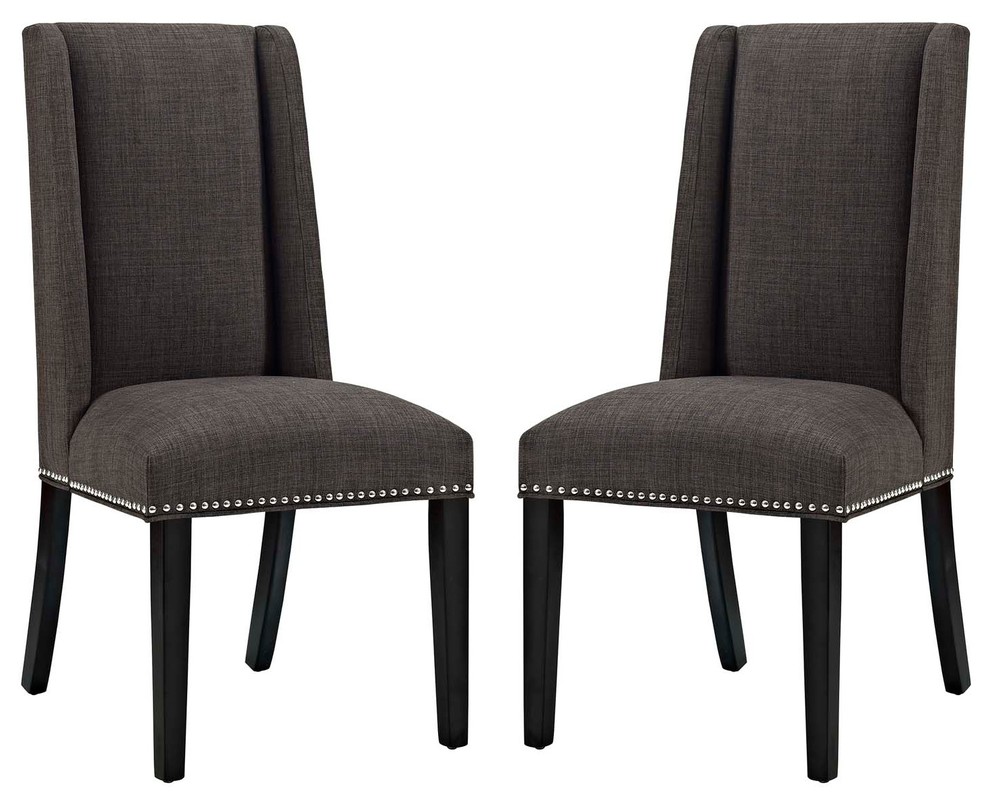 Baron Dining Chair Fabric Set of 2 - BrownExplore the vast riches of a treasured heritage with the Baron Dining Chair. Designed to resonate elegance, Barons features a charming back and polished nailhead trimmed seat with a dash of grace and noble appeal. Complete with dense foam padding, fine fabric upholstery, solid wood frame and legs with non-marking foot glides, Baron is a stylish dining chair perfect for the modern home.