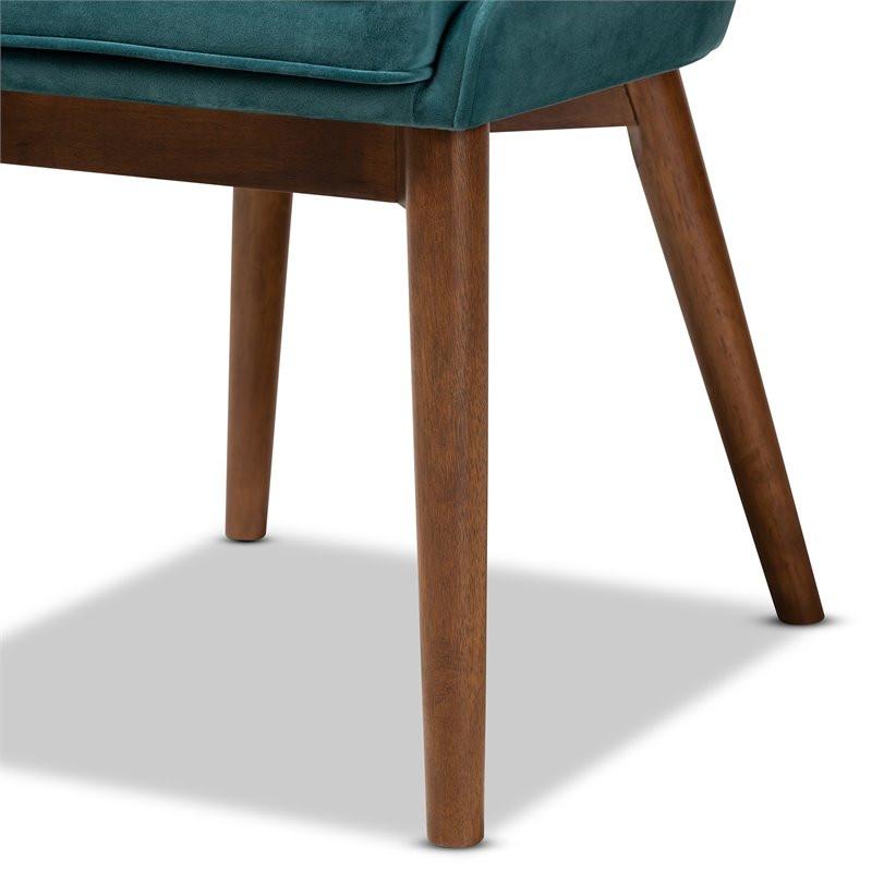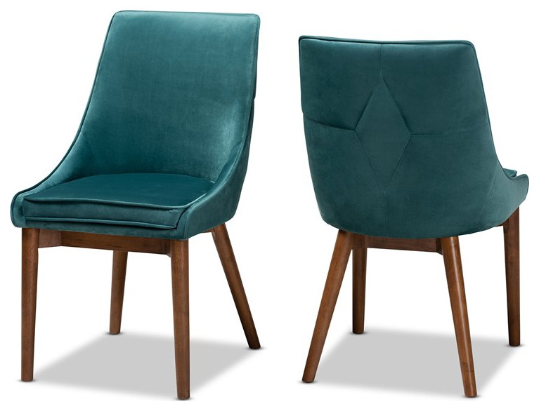 Glamour and comfort join together in harmony to create the Gilmore dining chair. Padded with foam underneath sleek velvet, the Gilmore is soft to the touch and features a diamond stitch pattern on the back. Made in Malaysia, this dining chair is supported by a sturdy, walnut brown finished wood base with angled back legs. This two-piece set requires assembly and features removable seat covers to make cleaning a breeze. Bring a retro style glamour to your home with the Gilmore dining chair. Dimensions: 34.3" high x 19.2" wide x 23.6" deep; Seating dimensions: 19.2" wide x 17.7" deep x 19.3" high (from Floor); Back: 15.9" high; Legs: 16" high;