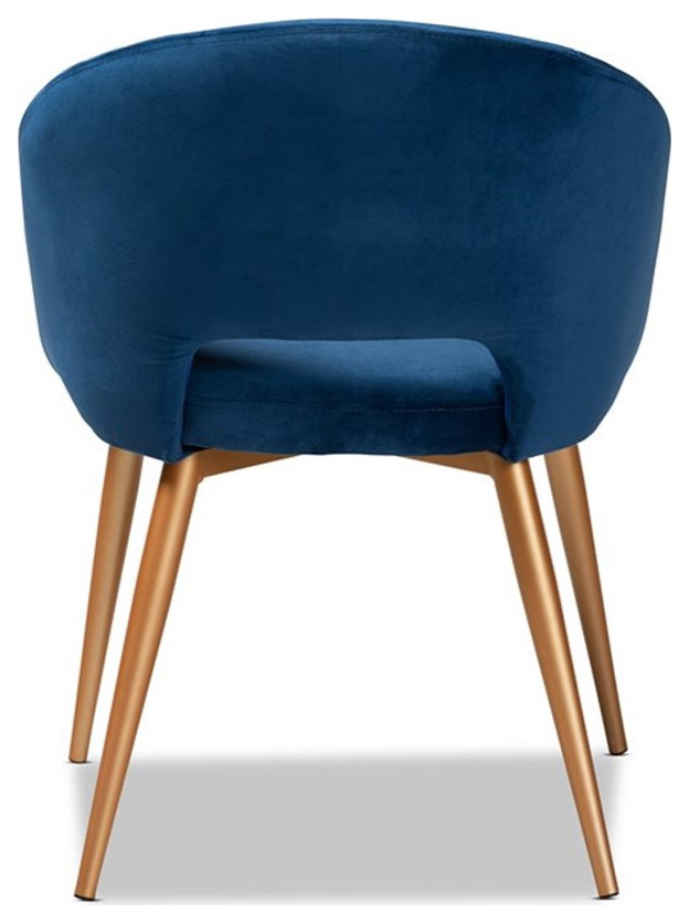 A retro design gets a luxurious update in the Bowery Hill dining chair. Upholstered in a soft, sumptuous navy blue velvet fabric, the Bowery Hill features a curved back and wide seat for the utmost dining comfort. The cut-out back design and splayed gold-tone legs give this chair a glamorous look. Use this versatile piece as a dining chair or as an accent chair in the living room. The Bowery Hill dining chair is made in China and requires assembly.