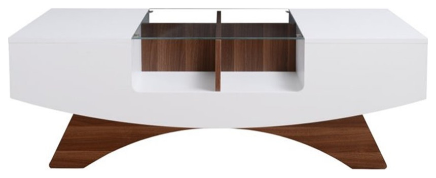 This modern wood coffee table boasts a rich white and light walnut finish and a distinctive shape that adds a touch of uniqueness to any living room. Its curved base leads up to a table top featuring a central cut out space, perfect for displaying decorative items or storing everyday essentials. The top is made of sleek glass, adding a stylish touch to the overall design. For extra storage space, the table also features slide-out drawers on both sides, allowing you to keep your belongings tucked away and out of sight.