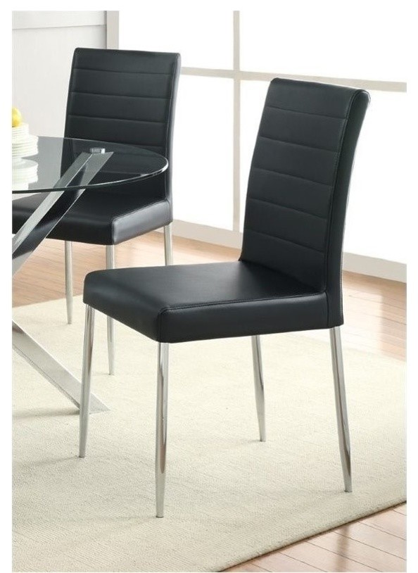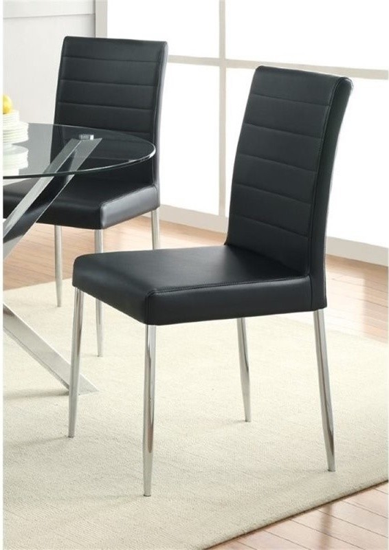 A soft, well-designed side chair is found in the Vance Dining Collection. The profile of this chair is eye-pleasing and not distracting. With a slight curve outward, the back is supportive and comfortable. Also adding comfort is the use of a smooth, faux leather in black. This chair sits on four chrome legs which are slim and true to a contemporary style.