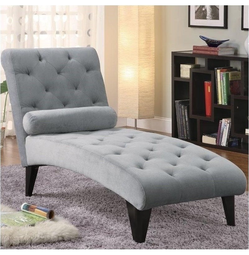 Great for any modern living room, this luxurious gray chaise emits class and comfort. Upholstered in a soft velour microfiber fabric, the silhouette features a high back and rolled details. Adorned with all-over deep tufting, the seat and back look stunning and plush. Relax with the included small bolster pillow that gives this chaise a welcoming look. Black tapered legs streamline the sophisticated details.