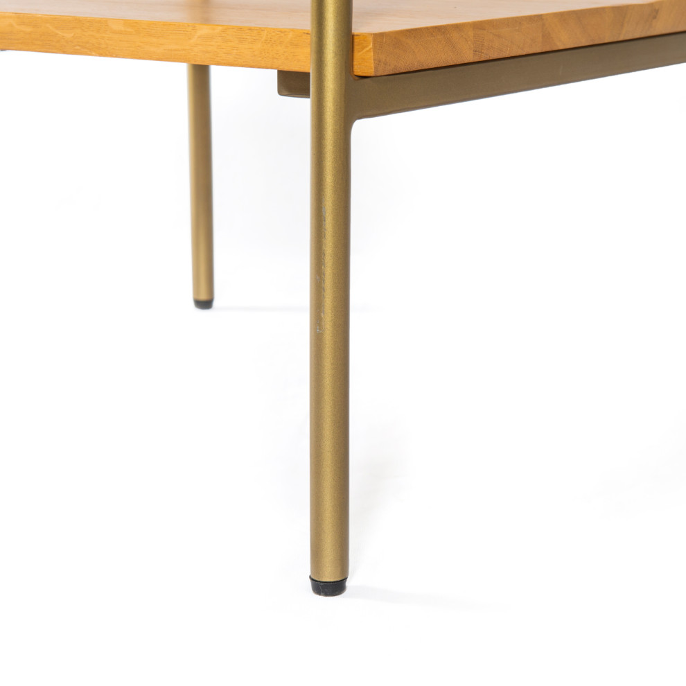 • Craft an open, airy look with natural oak and slim, satin brass-finished iron frame. A great spot to stack favorite books or rest a drink.