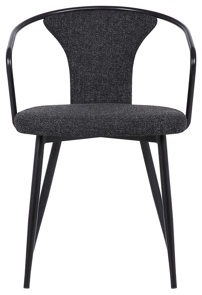 The Armen Living Charles contemporary dining chair is an excellent choice for the modern dining room, but features a practical design that allows it to function well as additional seating in just about every room of the house. The impressive Charles is made of durable Black Powder Coated steel that assures long lasting quality for many years to come. The chair's tall back design is inclusive of armrests for added support while the straight legs of the Charles include rubber nibs, preventing the chair from damaging the floor when moved. The Charles's seat is foam padded and upholstered in rich Black Fabric. An excellent modern home choice, the Charles is certain to blend well with any home decor, providing you with both a quality product and a aesthetic home accessory.