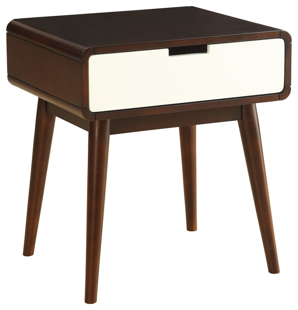 Invite fashion, function and chic midcentury style into your home with the Christa End Table. This high-contrast piece features a dark walnut frame, smart tapered legs and a white drawer face.