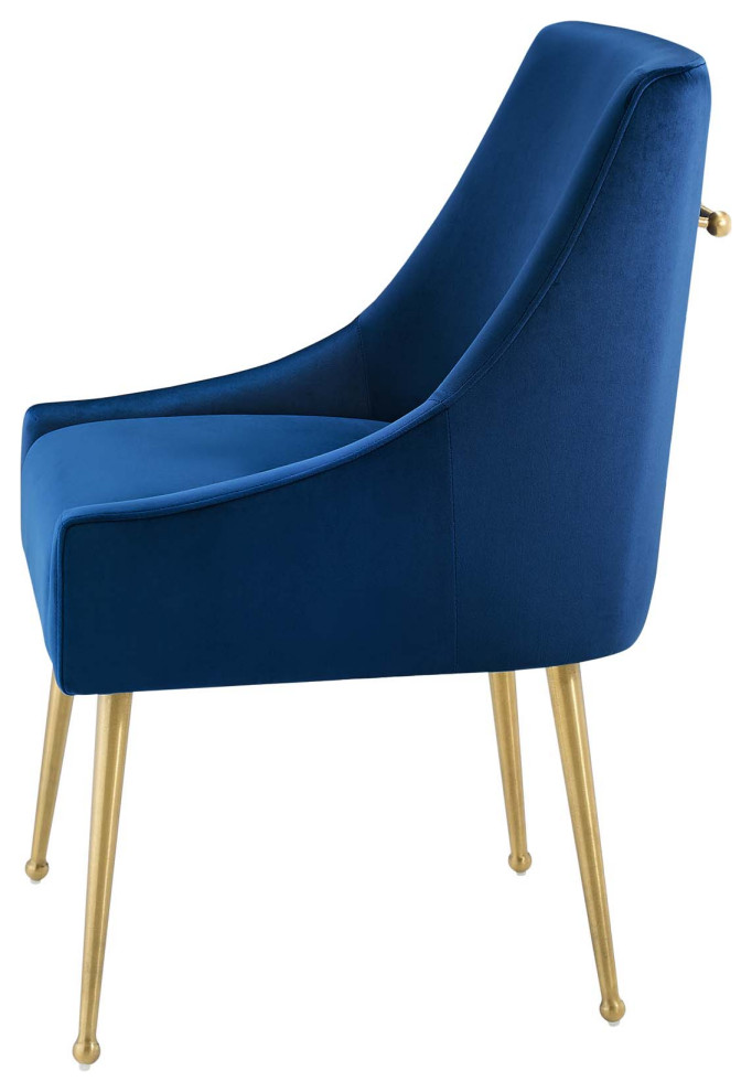 Gently sloping arms cascade down from the flowing design of the Discern Performance Velvet Dining Chair. Solidly constructed from wood and plywood, Discern comes with dense foam padding upholstered in stain-resistant performance velvet. Complete with splayed brushed gold stainless steel legs and matching decorative handle on the back of the chair, Discern is a soft and durable addition to the dining room, kitchen entryway, living room, bedroom, home office, or vanity. Create a cozy seating experience with this versatile dining accent chair with non-marking foot caps.