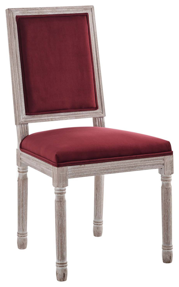 Revel in the whispered opulence of the Court Dining Side Chair. Featuring a fluted wood frame, dense foam upholstered performance velvet seat with elegant welting, this square back dining or accent chair harmoniously blends old world charm with modern intrigue. Designed with a vintage French look and an undeniable appeal, this velvet chair supports up to 331 pounds and comes with foot pads to preserve flooring. Comes fully assembled.