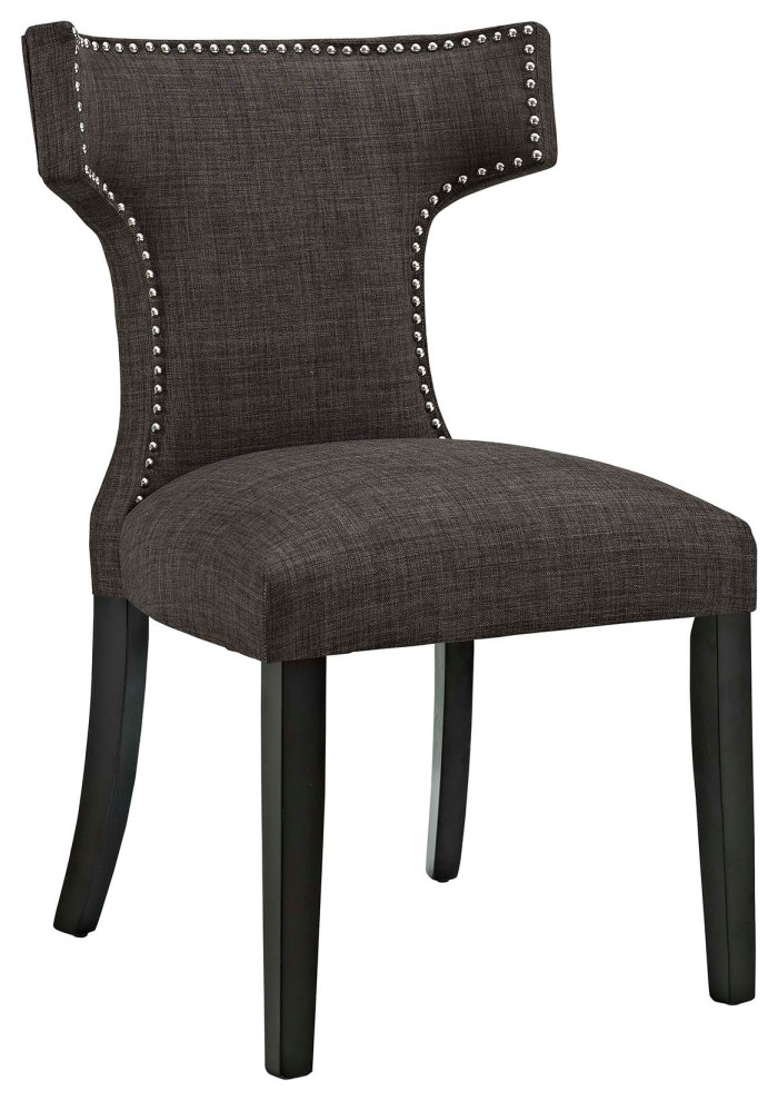 Transform your dining decor with the broadly designed Curve Dining Side Chair. Sweeping lines complement a minimalist shape for a chic look studded with nailhead trim. Curve comes generously padded with dense foam covered in polyester fabric, non-marking foot caps, and delivers just the right touch of finesse with tapered wood legs. Sporting an hourglass shape, Curve works well in a variety of dining room arrangements.