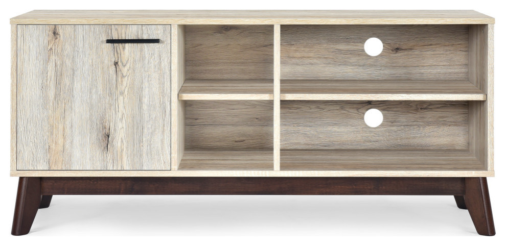MID-CENTURY MODERN: Blending together iconic splayed legs with a stunning wood frame, our TV stand offers a mid-century look to your lounge space. With its clean lines and understated look, this TV stand uses new materials to reimagine a traditional design.