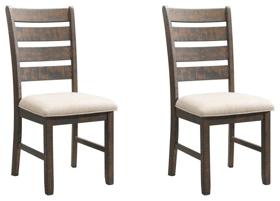 The Picket House Furnishings Dex Ladder Back Chair Set gives your dining room a hint of rustic charm. Its comfy seat is upholstered in a cream, linen-like fabric and accented by a wooden slat panel back. Its smokey walnut finish and distress marks give this chair a weathered and cozy look.