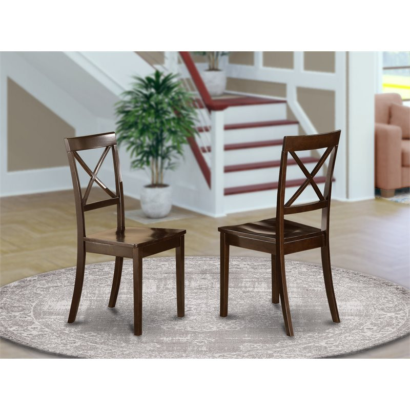 - These dining chairs feature comfortable wooden seat and cappuccino finish. Durable Asian hardwood x-back and legs which generates the ideal high-class color collaboration to offer a magnificent style to your dining area.