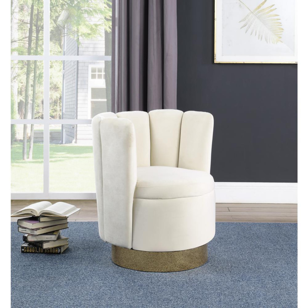 Include this glam contemporary swivel white velvet accent chair in your next upgrade! This accent chair features a velvet fabric upholstery with gold plated stainless steel base. The accent chair is perfect for any nook or small space. Accent chair is available in 5 colors - Blue, Black, Gray, Pink, or Cream.