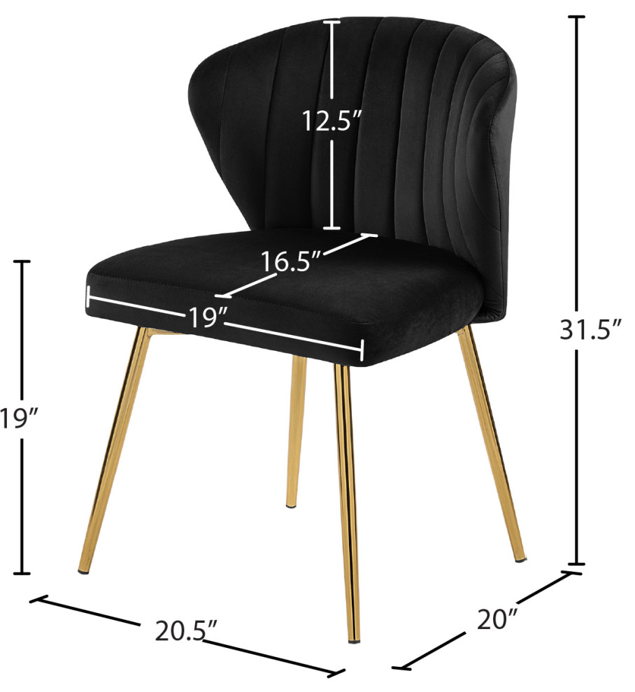 This Finley velvet chair, with its all-over soft black velvet upholstery, offers elegance and sophistication for your dining room. Designed to elevate your room's decor in an instant, this seat oozes refinement and beauty with its curved and channel-tufted back and rich gold metal legs. Pair this lovely Finley chair with your favorite contemporary dining table for a seamless presentation.