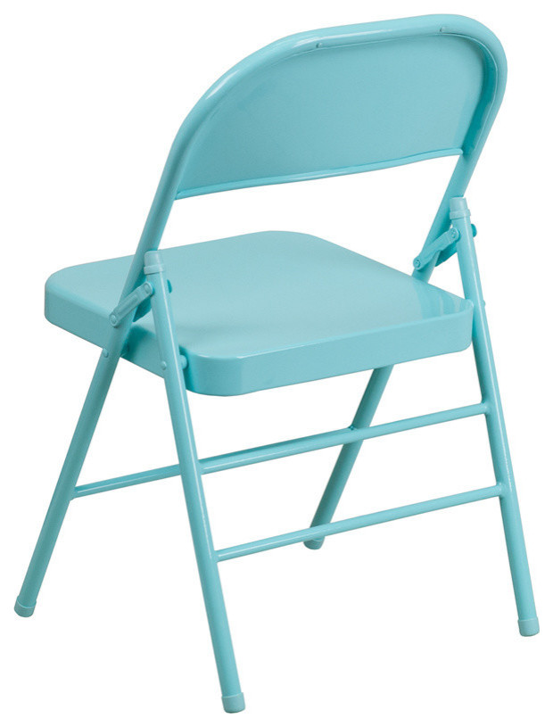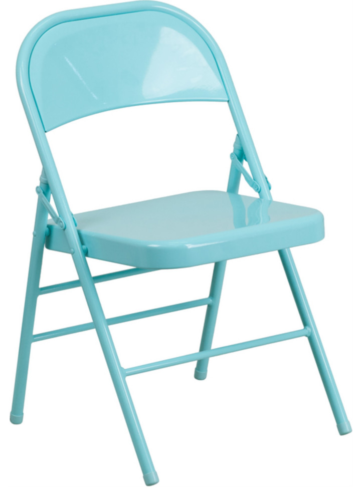 Hercules Colorburst Series Tantalizing Teal Triple Braced & Double Hinged Metal Folding Chair Spice things up with this vibrantly colored folding chair that will add so much personality to any room! These cool looking chairs can be used in the home, school or business to brighten up the area. This metal folding chair is a colorful option for everyday use or when you need extra seating in a residential or commercial location. It features a premium 18 gauge, curved steel frame. Though lightweight and easy to fold, transport and store, this chair is sturdy enough to hold up to 300 pounds. The legs are triple braced, with an integrated footrest, and double hinged with riveted steel components. Non-marring floor glides on the legs protect your floors by sliding smoothly when you need to move the chair. Suitable for indoor-outdoor use, store indoors to protect frame from excessive moisture. These brightly colored chairs are an affordably stylish way to brighten up your home, school or workplace. Product Dimension: 18"W x 19"D x 30.5"H