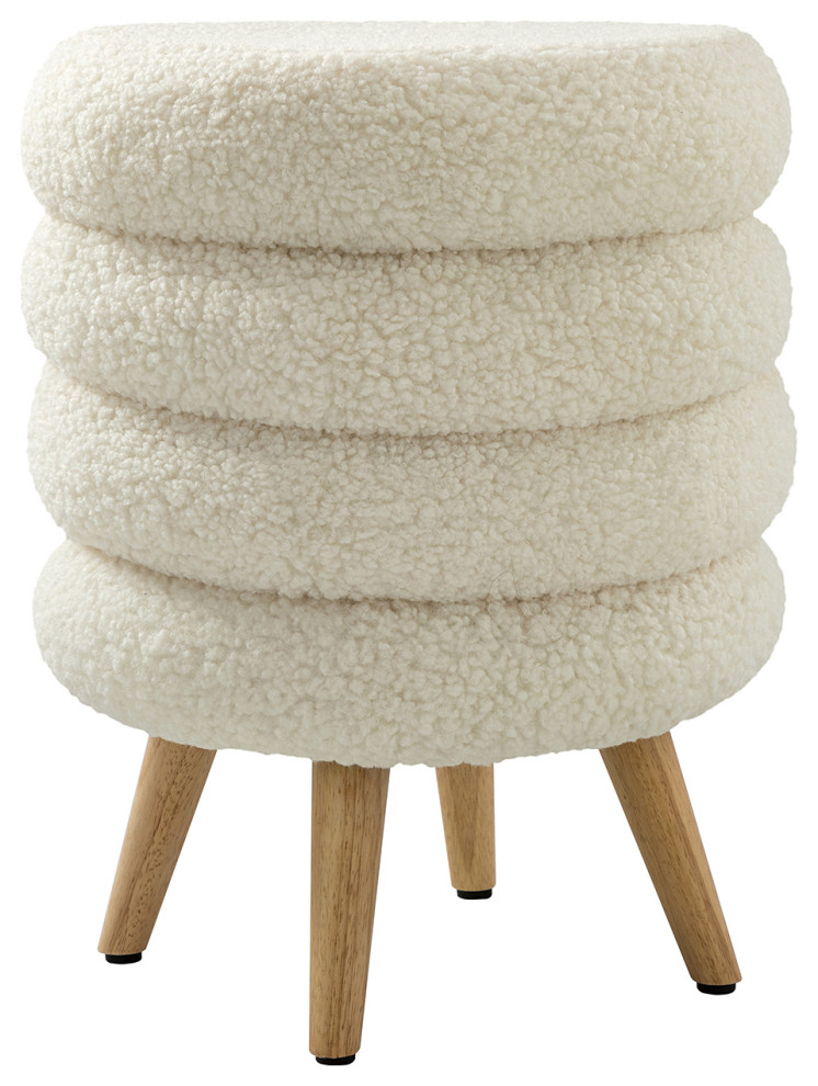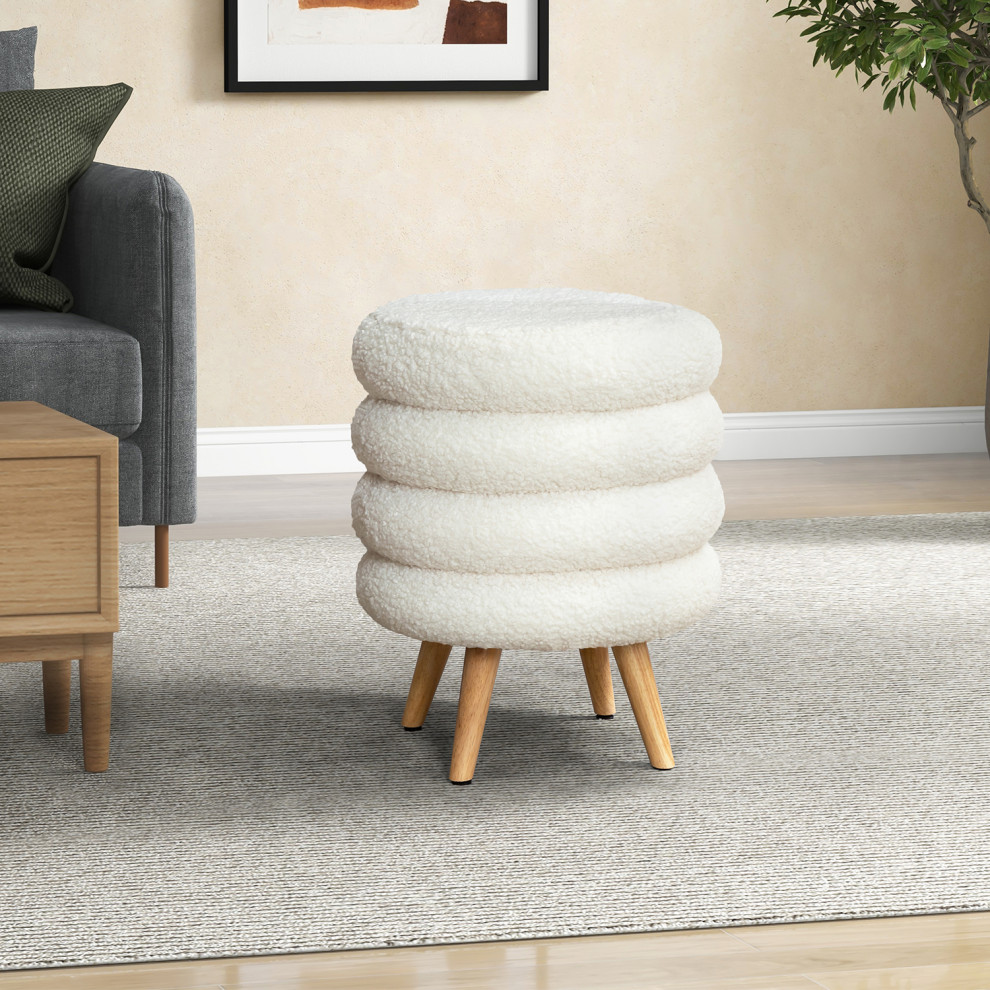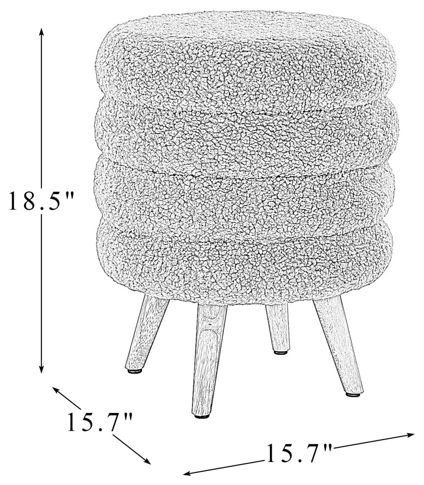 Real talk: With its ornate style and petite footprint, this ottoman is about to be your living room's new best friend. The unique shape makes this ottoman add a different scenery to your room. The material is Sherpa 100%polyester and the frame is wood filled with high-quality foam, it is pretty suitable when you or your pets sit on it and it has a long service life. The solid rubberwood legs with adjustable pads make this ottoman more durable and stylish. Ideal for a foyer, room entrance, moreover bedroom.
