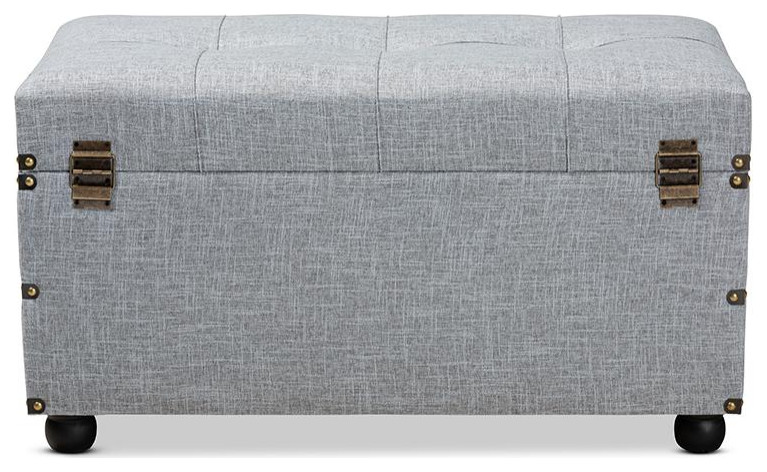 Stylish and versatile, the Flynn ottoman is an easy addition to any space. Set on top of black bun feet, the Flynn is upholstered in a chic grey linen-like fabric and features a cushioned lift-up lid that reveals extensive storage space. Two drawers located at the bottom provide additional storage space. Inspired by vintage steamer trunks, the Flynn is accented with antique brass latches and handles. Brass nailheads and button tufting add an extra dose of style. This versatile piece can be used as an ottoman, coffee table, or storage trunk. The Flynn ottoman is made in China and will arrive fully assembled.