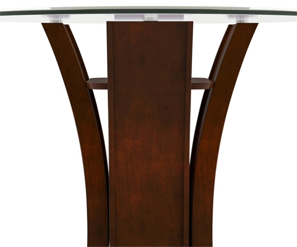Wood and glass combine in perfect contemporary style with this round end table. The table pedestal is composed from four pieces of solid wood and wood veneers in a dark cherry finish, flaring out and upward from their base with a streamlined impact, in addition to an open bottom shelf at the table base. The 10 mm glass tabletop adds perfect contrast to the vertical lines, resulting in a work that's an understated modern stunner.