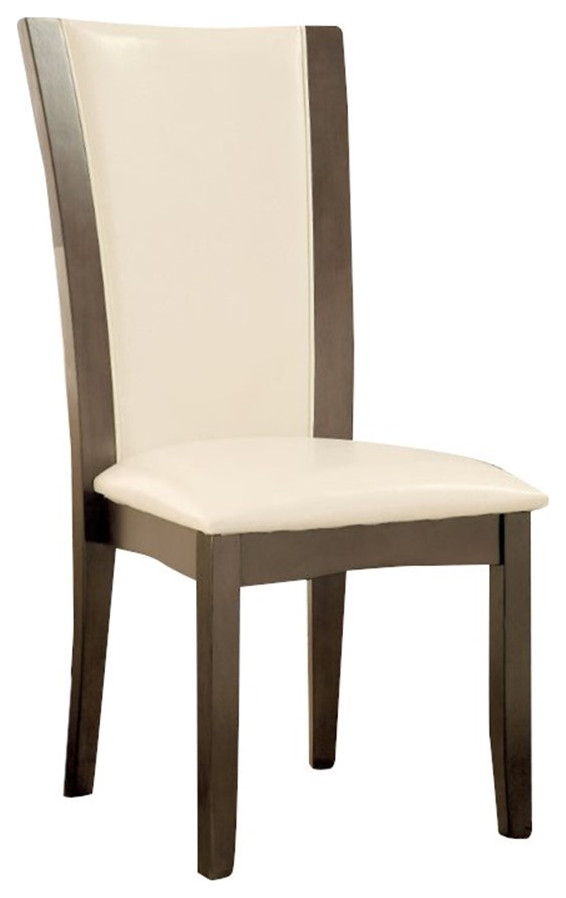 Bring an updated look to a modern or transitional dining space. Choose this elegant dining chair to make a good impression in a casual or semi-formal dining set with a dramatic flavor. Fashioned from solid wood and wood veneers, its high-back frame receives a lush gray finish. Sleek white faux leather upholstery creates an exceptional palette, as a padded seat is prime for comfort.