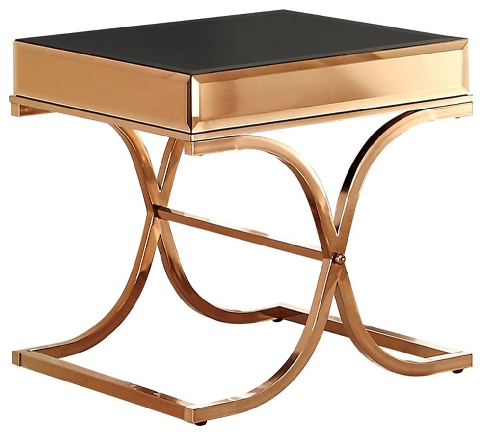 Give your home a future-forward bounce with the ultra-sleek design of this mirrored metal end table in gold. This piece is detailed with a 5mm smoke mirror glass rectangular top that offers plenty of space for a lamp and other decorative favorites. But the highlight might be the radiance of the curved X-cross metal framework that embodies this extravagant table that's perfect for the home with modern decor.