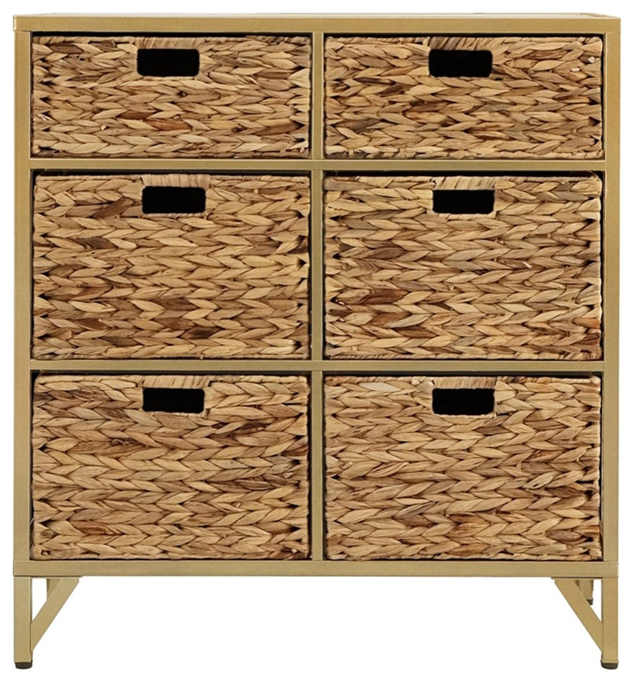 Clean and transitional with a touch of eclectic, our Rio 6 Drawer Cabinet has it all. Sturdy construction with a beautifully coordinated blend of metal, natural fiber, and wood. Each unit in our Rio Collection is a unique décorative and functional conversation piece and storage solution perfect for many rooms in your home. Walnut Patina, gray Patina or Natural Finish.