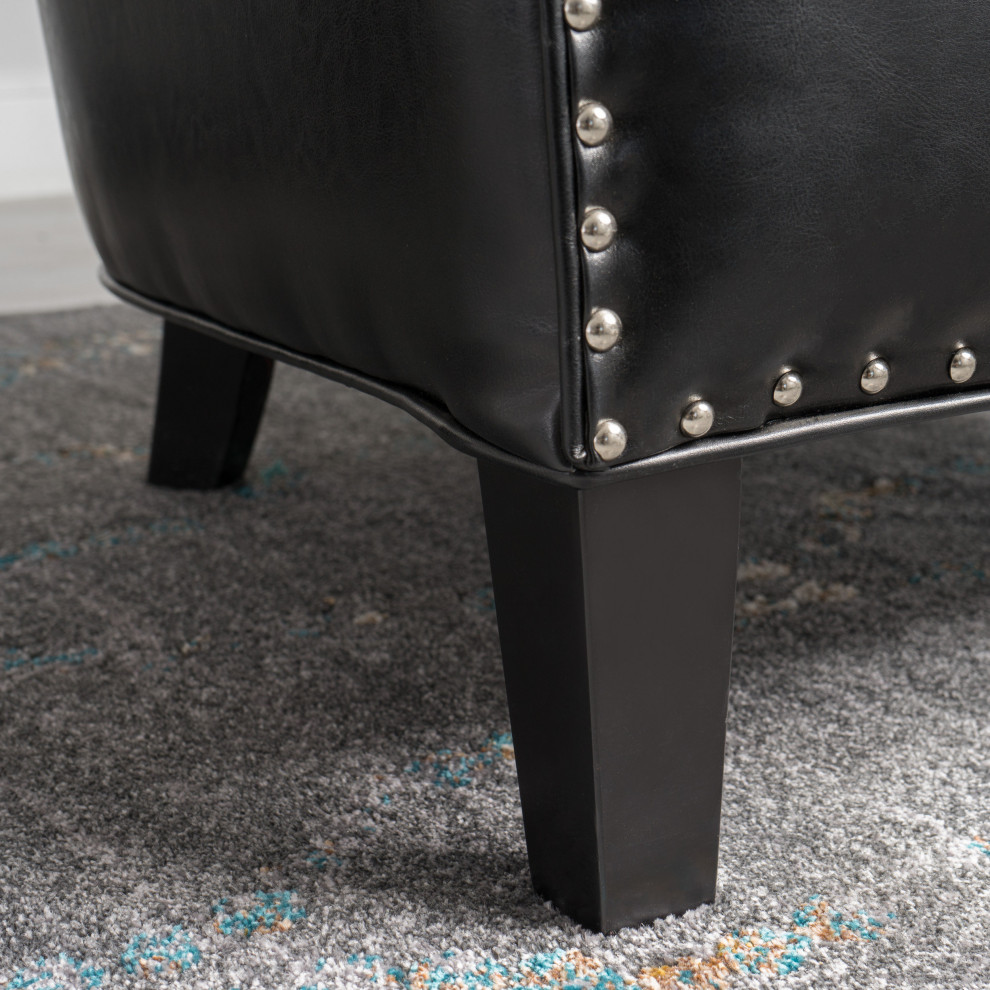 The Carlton Club Chair is a fusion of modern style with the luxury of fabric or bonded leather. Crafted with only the highest quality materials, our soft bonded leather or plush soft fabric with studded accents, this club chair provides extra comfort and an entirely new level of sophistication.It catches your eye with its curved arms and back, along with the chrome studs along the front, bottom, and sides. The chair's composition is completed with tapered legs in espresso finish.