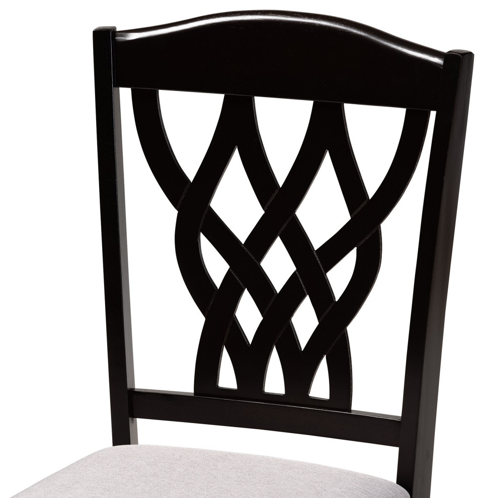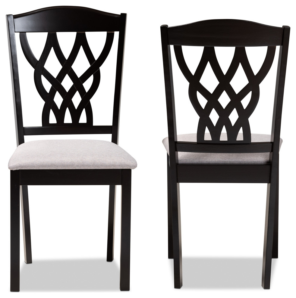 Baxton Studio Delilah Modern and Contemporary Grey Fabric Upholstered and Dark Brown Finished Wood 2-Piece Dining Chair Set Modernize your dining space with the remarkable style of the Delilah dining chair. Made in Malaysia, the Delilah is constructed from sturdy wood finished in a rich dark brown. The seat is upholstered in soft fabric and padded with foam for supportive comfort. Requiring assembly, the back features a unique cut-out design that allows light to flow through, providing a more open feel in tight spaces. Ideal for both casual meals and formal occasions, the Delilah easily elevates the modern home.