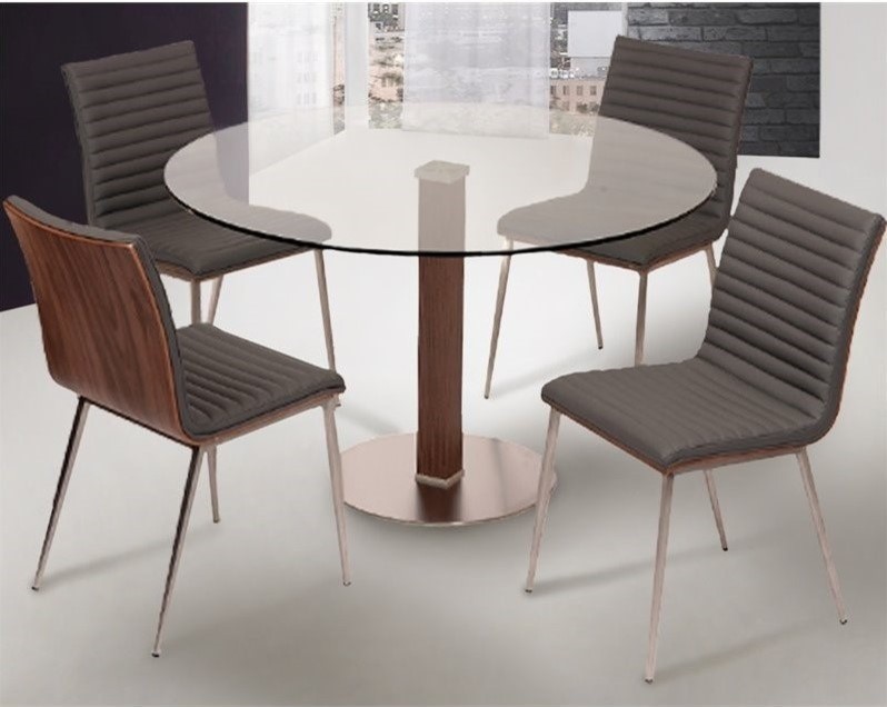 Make an unforgettable statement by adding the Hawthorne Collections modern dining chair to your dining area. This clean, elegant chair is upholstered in Gray Pu, great for contemporary spaces. The frame is made of brushed stainless steel and the back is designed with walnut veneer. It is amazing how much this stylish and affordable chair can change the decor of your room.