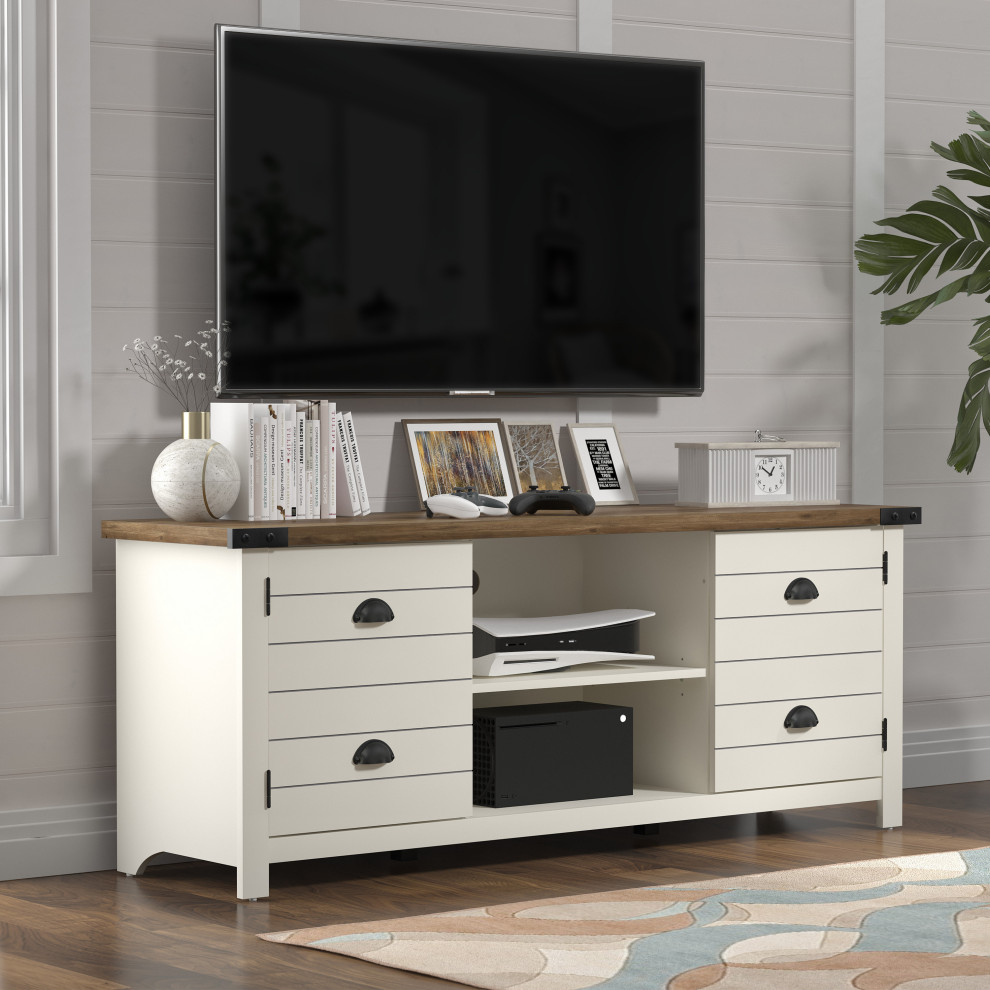 Bring a fresh, light focal point to your living room with this farmhouse-inspired 60-inch TV stand. Crafted from high-grade engineered wood, this gaming-ready TV stand boasts adjustable shelves with two doors for out-of-sight controller, headset, and hardware storage. Two central open shelves provide ample space for electronics and gaming consoles while built-in cord management ports keep cables nice and tidy behind the scenes. The fashionable ivory finish and a contrasting knotty oak top bring an airy, tidy feel to any space. Assembly required.