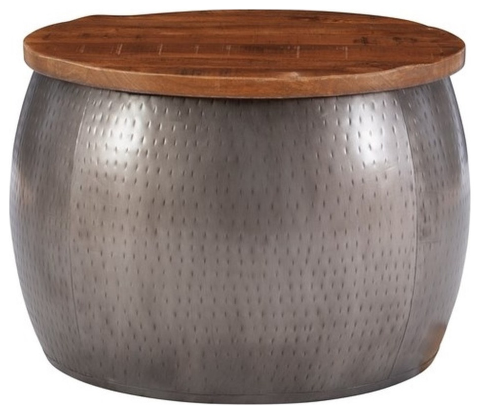 - Reid Metal and Wood Drum Side Table with Storage in SilverAdd a touch of elegance to your home with this hammered metal storage drum. Handcrafted in India, the subdued silver finish of the metal body and rich texture of the solid wood lid create a rustic and eye catching contrast. The lid lifts off to reveal hidden storage, perfect for extra blankets, pillows or rogue remote controls. Measuring 19” from the ground, this versatile accent piece doubles as a small table and subtle storage that fits wonderfully next to a couch or set of chairs.