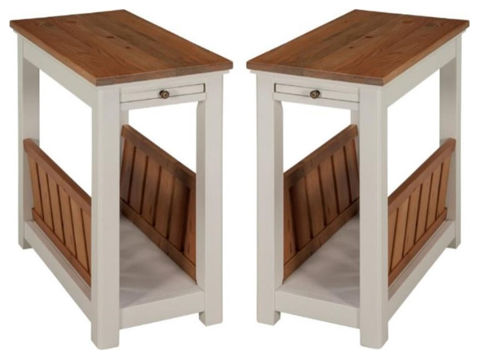 - Chairside Magazine End Table w/Pull-out Shelf Ivory with Wood Top collection offers modern cottage styling; with its wood top and white painted legs it offers fresh style to your living space. includes end tables, console tables and media/storage pieces. You can design the perfect living room for your home. This narrow end table features a pull out tray shelf and magazine rack for additional storage or display space. The pine construction makes this piece sturdy and durable.