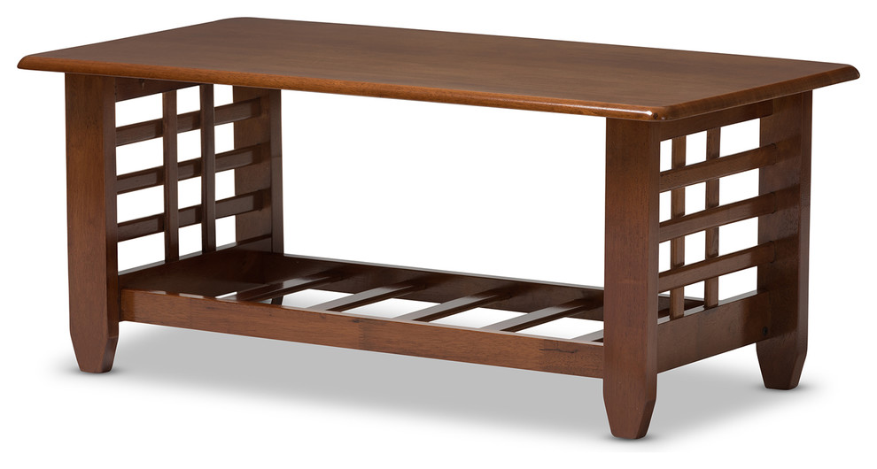 This coffee table is ideal to create an inviting cozy corner in your living space. A perfect fusion of age old artisanship and modern aesthetics, the table goes well with contemporary and ethnic decor alike. With an airy window pane design wood frame, the Larissa wooden coffee table is a great addition to compact homes. Featuring mission style modern classic design, the Larissa coffee table is constructed of eco-friendly solid rubberwood and rubberwood veneer. The table features strong and durable ready-to-assemble construction with slatted shelf for magazines and books. Supported by chunky wood blocks on four sides, the coffee table, with beveled edge, is finished in cherry finishing. The table looks great from all angles, whether in a lounge arrangement, public waiting area or private office. Made in Malaysia, the occasional coffee table requires assembly.