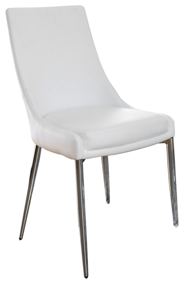 Transform your living quarters into a place for ultimate relaxation with this stylish pack of two side chairs. Constructed of metal in chrome silver finish, it features white faux leather upholstery that makes a perfect contrast to this chair. It has angled back with cushioned seat that provides a comfortable seating for hours.