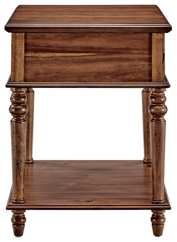This elegant rectangle end table with wood veneer will effortlessly add style and function to any room in your home. The stunning turned legs support both an ample table top with a large drawer and a lower shelf for additional storage or display. A delicate, beautifully designed metal knob adds the perfect punctuation to this classic design. Perfect for any living room, family room, bedroom or entry, this table will be a part of your decor for years to come!