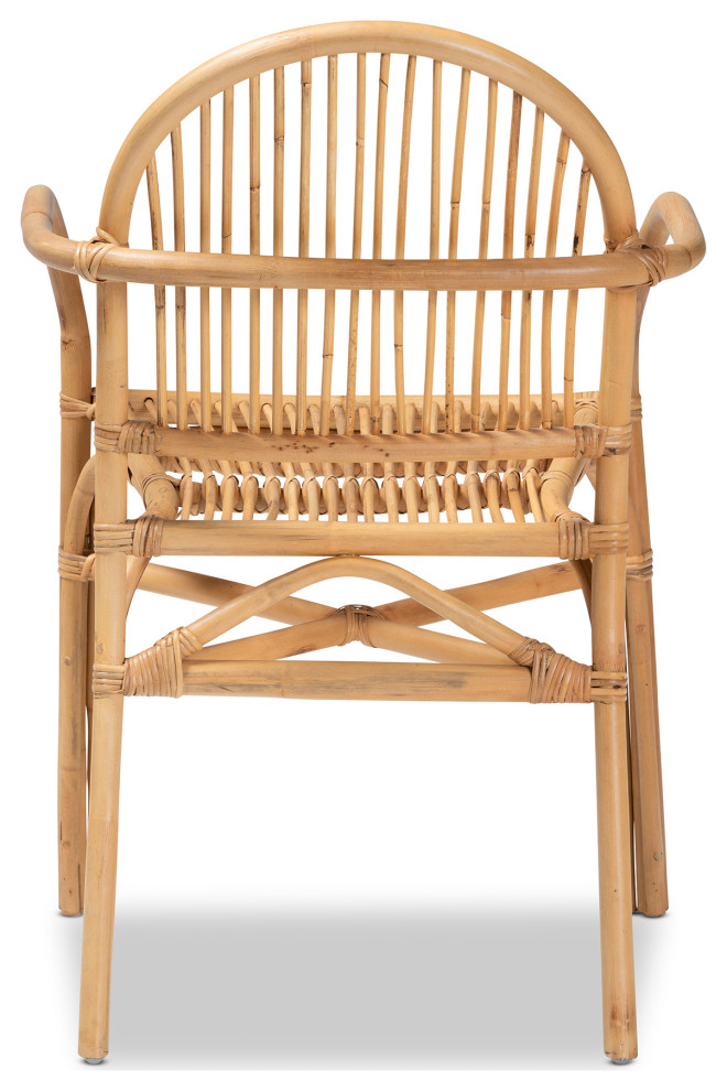 Renew the adoration for your dining space with the remarkable allure of the Lissa dining chair. Made in Indonesia, this chair is handcrafted by skilled artisans with natural rattan. The round backrest is interlaid with slim rattan rods for a smooth embrace, while the pronounced armrest offers convenient comfort. The Lissa will arrive fully assembled and features angled legs connected by a crisscross base for excellent stability and support. Encapsulating the allure of an exotic retreat, the Lissa dining chair elevates the mood of any occasion.
