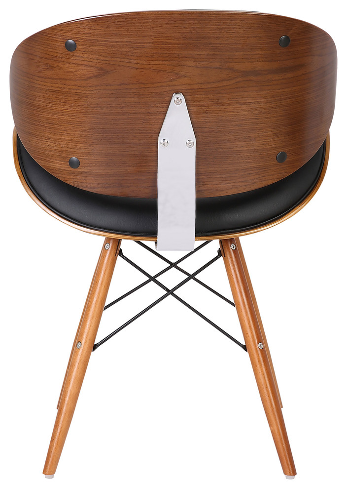 The Dwellist Lutheran mid-century dining chair features a clam-shell seat frame, presenting a unique spin on the traditional modern chair design. This dining chair features an elegantly curved back framed in a walnut wood finish. The plump Faux Leather upholstery of the piece is padded with foam, offering excellent lower back support. The eiffel leg design features metal wires which enhance the suitability and durability of the tapered walnut wood legs. The Lutheran even comes with floor protectors to further ensure stability and minimize the risk of floor scratches. The Lutheran's upholstered seat is available in two beautiful colors; black and gray.