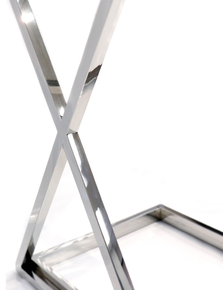 Your quest for the ultimate side table has come to an end-that is if you lean toward contemporary. Decked out in a chic finish, the angled metal base is striking from every angle. The coylin square end table is topped off with a clear glass top with steel edging for a completely modern look.