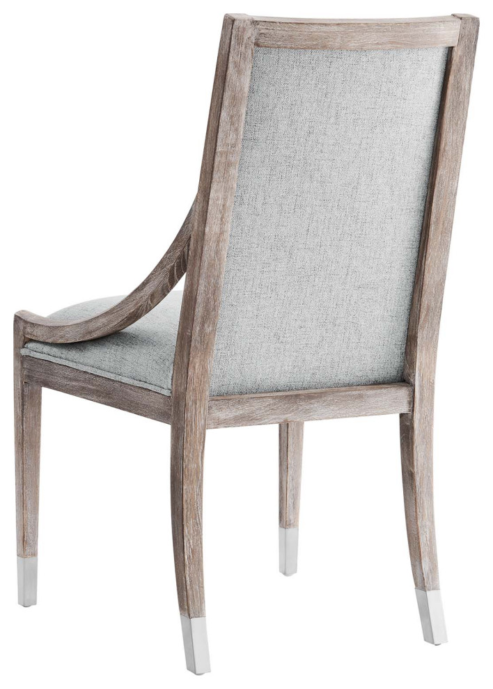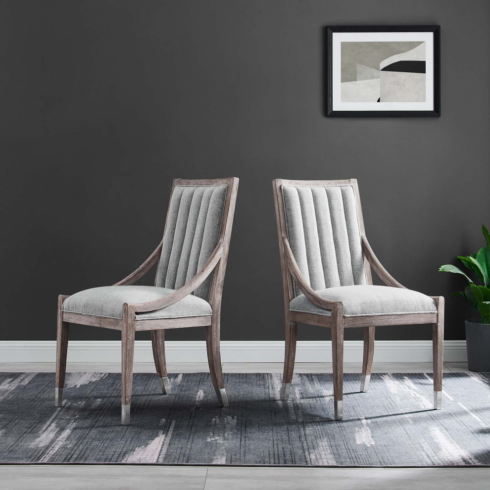 Revel in vintage charm and modern comfort on the Maison Fabric Dining Armchair Set of 2. Featuring vertical channel tufting along the backrest, gently sloping armrests, and subtle piped trim along the frame, these dining armchairs are a pleasing blend of old world French style and rustic aesthetics that pair beautifully in vintage or modern farmhouse decors. Upholstered in a versatile polyester linen textured fabric, this dining chair set grants a premium seating experience with dense foam padding. This dining armchair set rests atop wood legs with brushed metal sleeves and non-marking foot caps and is crafted with sturdy rubberwood with a weathered finish. Weight Capacity: 331 lbs.