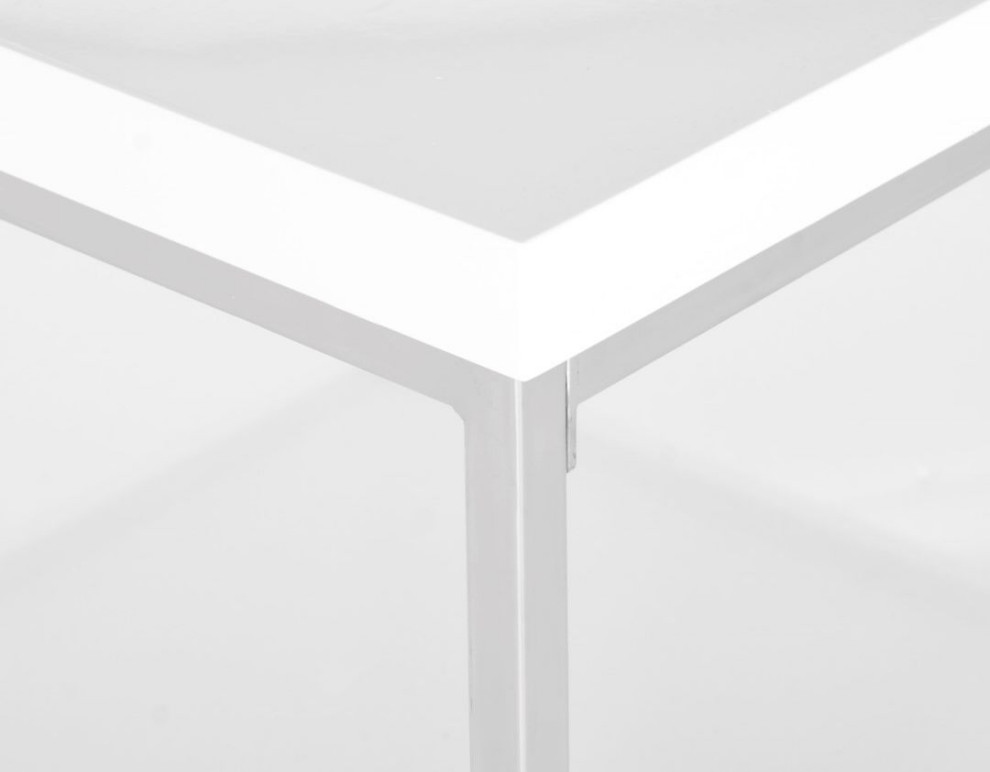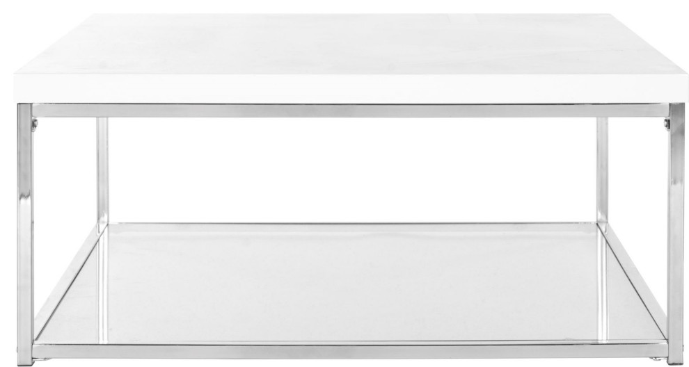 Retro modern design is celebrated in the clean-lined contemporary Malone coffee table. This handsome piece is crafted with white lacquer look finish on its top, chrome frame and a bottom shelf of tempered clear glass for magazines or curios.