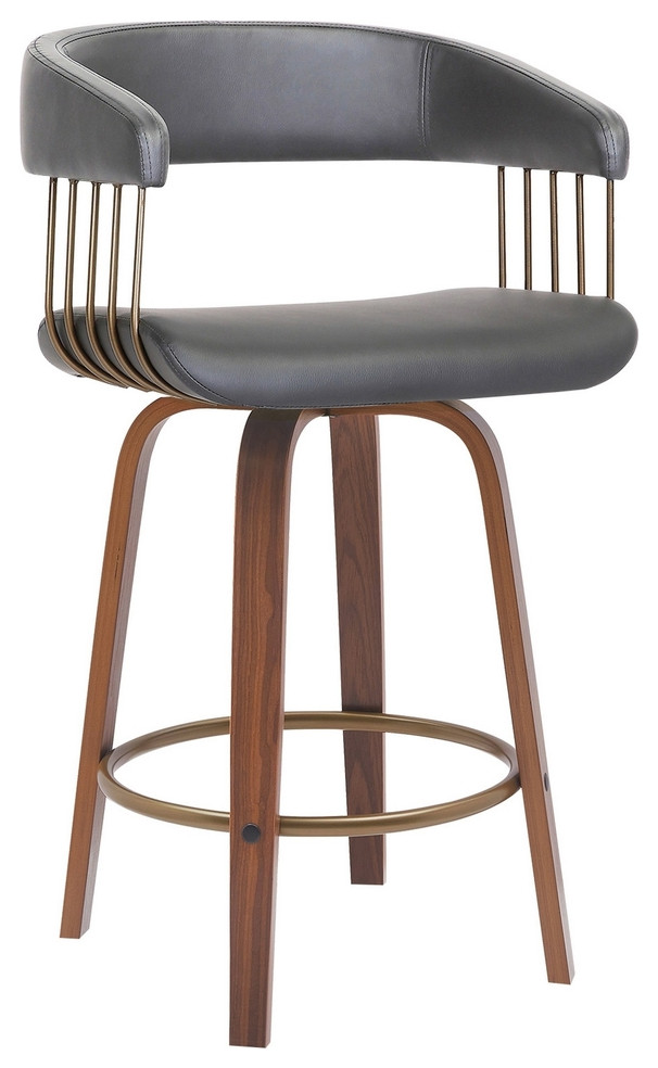 Adorn your kitchen island or counter height table with a warm, modernity style when you choose our Maya counter height chair. Upholstered in soft vegan faux leather in a classic gray tone, it has slatted bronze metal bars and walnut brown wood legs. All finished off with a round footrest and smooth 360 degree swivel functionality. Check out our Maya collection for sizes and color options.