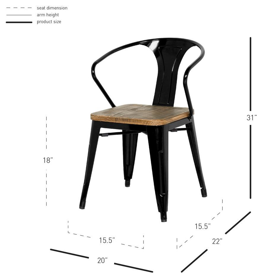 Popular bistro and cafe style metal chair with wood pine seat. Featuring X-brace seat support for stability and sturdiness, rubber feet on all legs for scratch prevention. For indoor use.