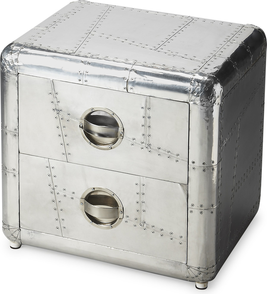 Crafted from polished and riveting aluminum, this bold Chairside Chest provides two drawers for substantial storage. It shimmers for sure... a brightest spot that absolutely will not be ignored.