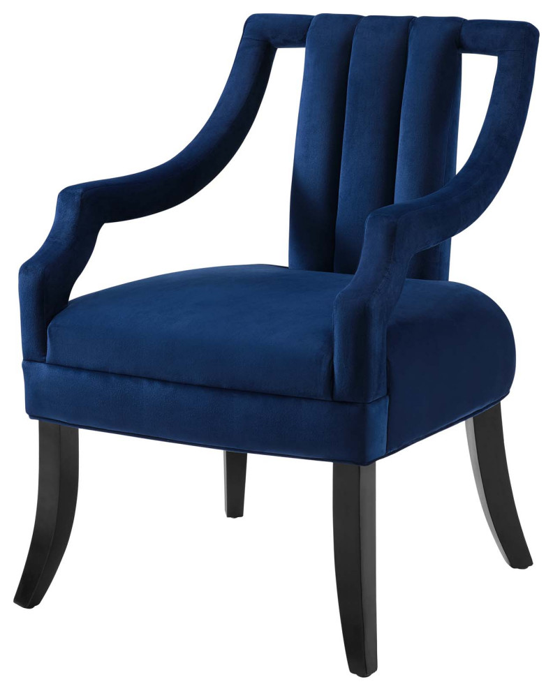 Embrace lively conversation with the Harken Accent Chair. Sloped armrests meet a cut-away vertical tufted backrest for a decor update that adds vintage glamour to any space. Harken comes upholstered in stain-resistant performance velvet upholstery, with dense foam padding, and black-stained birch wood legs with non-marking foot caps and a sinuous spring support system that provides gentle give. Harken's versatile design makes it the perfect accent chair to complement your living room, lounge area, entryway, bedroom, or home office.