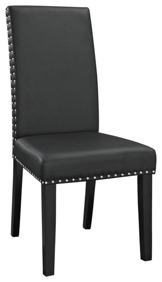 Wrap up moments of quality seating with the Parcel Upholstered Faux Leather Dining Room Side Chair. Finely upholstered in durable faux leather upholstery with elegant nailhead trim, the Parcel Accent Chair delivers a modern offering that enhances the dining room experience in a subtle and unassuming way. Padded with dense foam and supported by black stained tapered wood legs, the Parcel Side Chair is a stylish addition to your dining room, living room, lounge room, or office. Chair Weight Capacity: 285 lbs. Assembly Required.