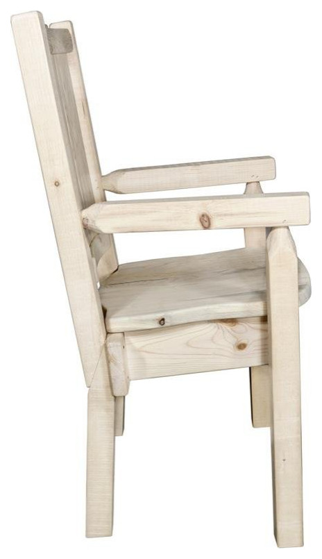 At the head of the dining table, at a desk or any place where a robust yet comfortable chair may be required, this captain's chair incorporates a rustic themed, laser engraved bear motif on the back. Hand crafted using the tried and true mortise and tenon joinery system that has served as a symbol of durability for millennia, this chair is as strong as it is unique. Legs and back are square sawn for a look uniquely reminiscent of the timber-framed homes once found on the American frontier. Seat height is 18". Seat width is 18.5". Seat depth is 17". Capacity 350 pounds. This model features the standard, ergonomically designed wooden seat. Fully assembled. This item is sold "ready to finish". Apply your favorite lacquer or stain and lacquer to match existing decor. All Montana Woodworks products come with a 20-year limited warranty included at no additional charge. Hand crafted in Montana U.S.A. using genuine lodge pole pine!