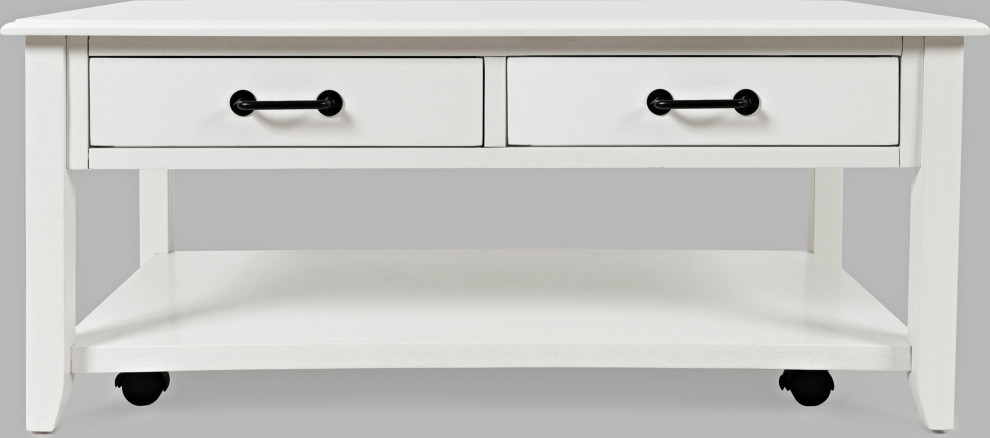 Farmhouse furniture made from solid hardwood Acacia with a weathered Country White finish is the signature of our North Fork Coffee Table. Measuring 44'' long and featuring two full-size drawers that slide out in both directions, this table comes with metal alloy hardware and optional casters to enable movement anywhere in your home. Simple and functional, this collection compliments a wide range of styles.